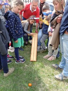 Um die gefundene Eieranzahl noch zu steigern, stand man zwischen den einzelnen Suchrunden noch Schlange beim beliebten „Eierringeln“: Reinhold Filip vom Museumsverein, unterstützt von seiner Familie, brachte den Kindern das historische Spiel bei und gab Tipps, wie man einen Metallringel so geschickt ein Holzbrett hinab schubst, damit er das untenliegende Osterei auch möglichst gut trifft. Dass dazu viel Glück und Geschicklichkeit gehören, lernten die Kinder schnell, und Filip war stets von einer Schar spielwilliger Kinder jedes Alters umringt. Seinen Gleichgewichtssinn testen konnten die Buben und Mädchen beim Stelzenlauf, was auch eifrig ausprobiert wurde. Insgesamt ein gelungener und kurzweiliger Nachmittag, bei dem die Besucher aller Altersstufen nicht nur etwas über bäuerliches Leben und Arbeiten vergangener Zeiten lernten, sondern zusammen viel Spaß haben konnten.