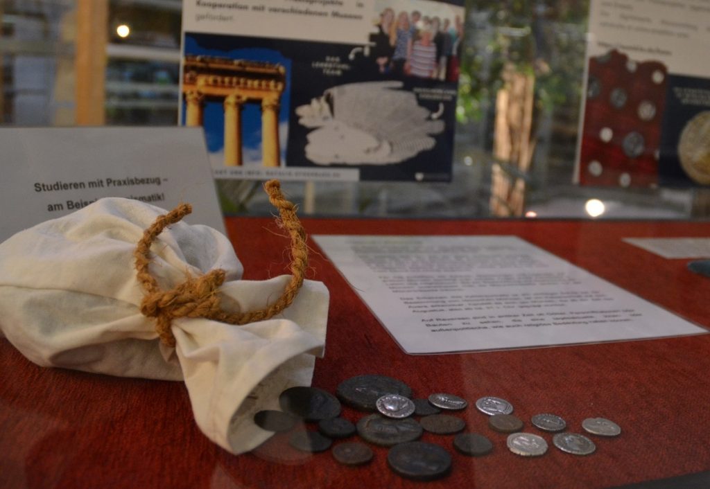 Eine Etage tiefer in derselben Vitrine sieht es ein bisschen nach Schatzsuche aus. Hier präsentiert sich die Spezialdisziplin der Numismatik, also der Münzkunde. Und das natürlich mit originalen antiken Münzen, die aus der Lehrsammlung der Universität stammen. „Wir leihen uns auch von den Netzwerkpartnern, also den Antiken-Museen in Bayern, Fundmünzen aus“, erklärte Natalie Stöhr vom Lehrstuhl für Alte Geschichte. Die Studierenden „beackern“ selbige regelmäßig im Rahmen ihres Studiums: Wer oder was ist vorne und hinten drauf, vielleicht ein römischer Kaiser? Gibt es einen religiösen Bezug und ist Text zu entschlüsseln? „Münzen erzählen Geschichten. Sie waren auch Kommunikationsmittel, denn der Prägeherr und seine Münzmeister prägen Botschaften darauf. Man kann dazu auch Marketingpflege sagen.“ Schließlich kam nur das auf die Münze, was der Herrscher auch vermitteln wollte – meist in Bildern. Antikes Instagram sozusagen. (ma)