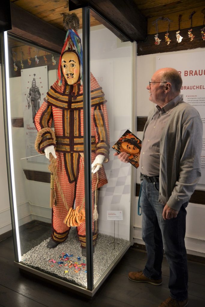 So sind die historischen Kostüme nun – wohl temperiert und bestens ausgeleuchtet – hinter Glas im Museum zu bestaunen. Das älteste erhaltene Maskenkostüm ist der spätbarocke sogenannte „Brandstetter Nickl“, der 1810 nachweislich in Familienbesitz war. Erst 2020 seinen Weg ins Museum gefunden hat ein anderes Kostüm: „Der Leihgeber aus der Nähe von München hat uns im Internet gefunden. Er hat seinen Speicher aufgeräumt und das Kostüm entdeckt und dann Kontakt zu uns aufgenommen.“ Die Expertenanalyse ergab schließlich, dass das Kostüm aus der napoleonischen Zeit stammt, was unter anderem an den Rauten zu erkennen ist.
