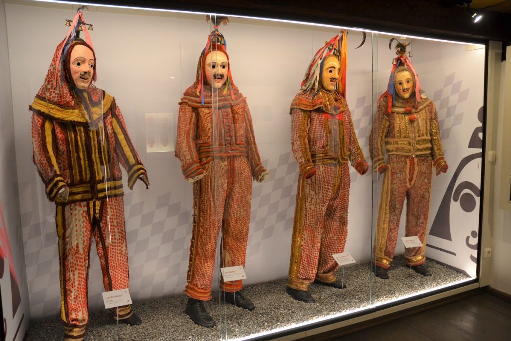 So sind die historischen Kostüme nun – wohl temperiert und bestens ausgeleuchtet – hinter Glas im Museum zu bestaunen. Das älteste erhaltene Maskenkostüm ist der spätbarocke sogenannte „Brandstetter Nickl“, der 1810 nachweislich in Familienbesitz war. Erst 2020 seinen Weg ins Museum gefunden hat ein anderes Kostüm: „Der Leihgeber aus der Nähe von München hat uns im Internet gefunden. Er hat seinen Speicher aufgeräumt und das Kostüm entdeckt und dann Kontakt zu uns aufgenommen.“ Die Expertenanalyse ergab schließlich, dass das Kostüm aus der napoleonischen Zeit stammt, was unter anderem an den Rauten zu erkennen ist.