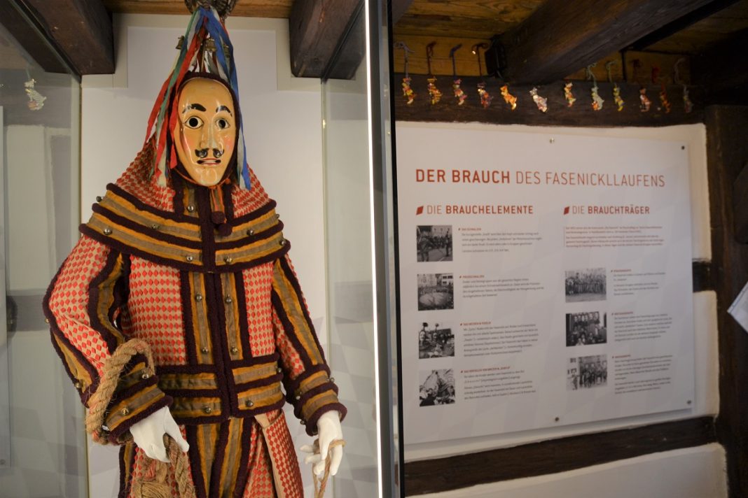 Und da sind wir schon beim Kostüm: Der Fasenickl trägt eine Jacke aus weißem Leinen mit Wollborten, Samtstreifen, Goldborten, Rauten und Rollen-Glöckchen, dazu eine Hose mit den selben Verzierungen. Auf dem Kopf sitzt der sogenannte „Scheberer“ (kommt vermutlich von scheppern), eine gugelförmige Kopfhaube mit Holzmaske. Oben drauf befinden sich ein Schellenbaum und Federn. Handschuhe, schwarze Lederschuhe und natürlich die „Goaßl“ komplettieren den Fasenickl. All das wird höchst aufwändig in Handarbeit hergestellt. Einen Eindruck davon kann man sich im Museum machen.