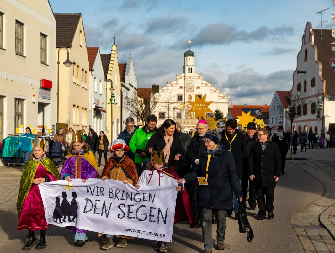 Nach dem Gottesdienst in der Pfarrkirche von Gaimersheim zogen die Sternsinger durch die Straßen der Marktgemeinde im oberbayerischen Landkreis Eichstätt. Vor dem Rathaus wurden sie von Bürgermeisterin Andrea Mickel empfangen und wünschten den Segen.