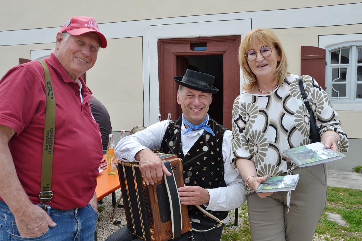 Petra Hochmuth, eine Enkelin von Xaver Funk, überraschte Museumsbetreuer Dominik Harrer mit einem Buch über die Funk-Traktoren; links der ehemalige Vorsitzende der Oldtimerfreunde Irgertsheim, Moritz Liepold