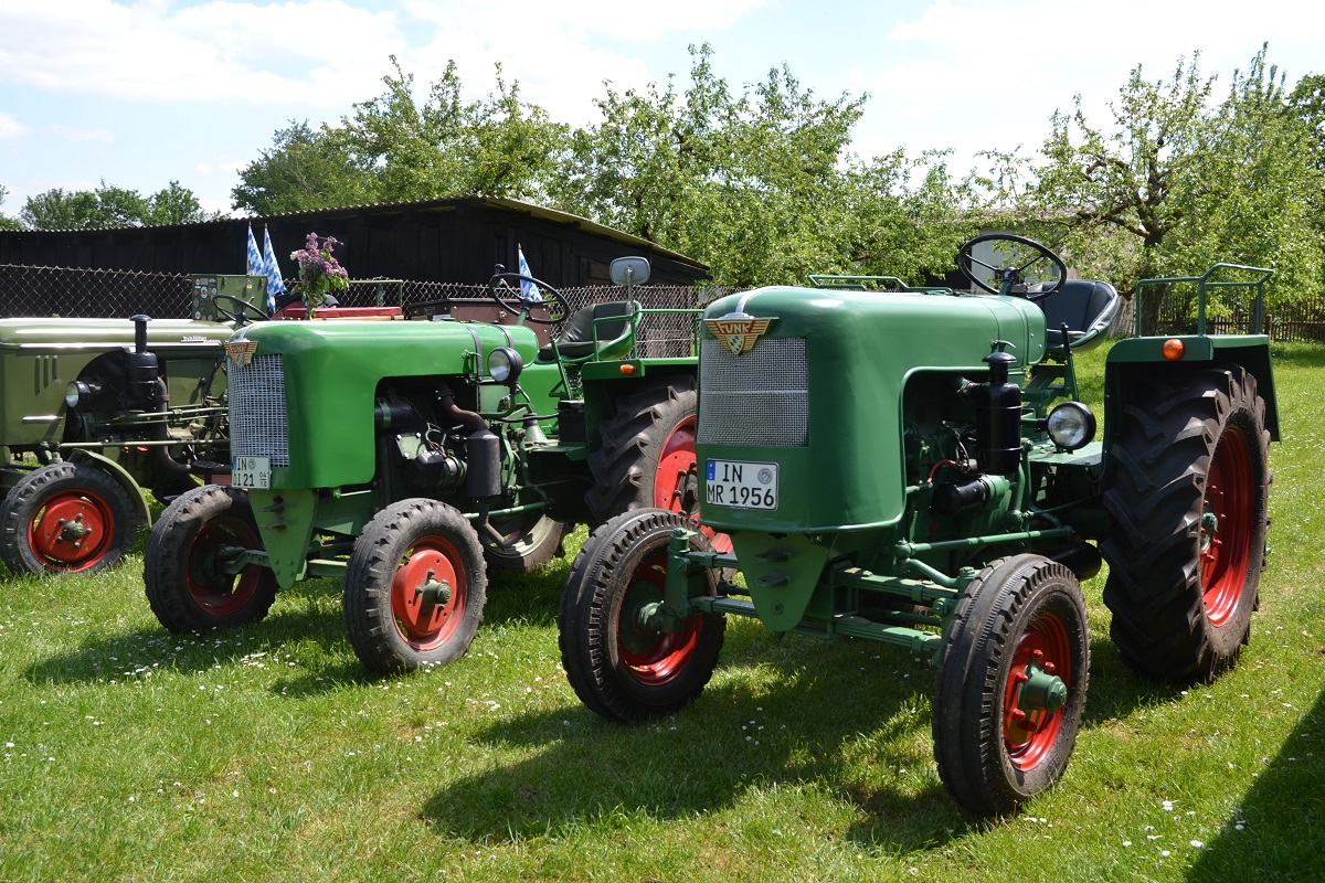 „Es freut uns, ein keines Stück Traktorenproduktion in der Region wieder lebendig machen zu können,“ erklärte Eichstätts Landrat und Vorsitzender des Jura-Bauernhof-Museum e.V. Alexander Anetsberger bei der Ausstellungseröffnung an Christi Himmelfahrt. Die Funk-Traktoren, die von 1950 bis 1956 hergestellt wurden, bezeichnete er als „Kraftprotze“ der damaligen Zeit. Anetsberger dankte allen Beteiligten und ganz besonders den Oldtimerfreunden Irgertsheim, deren Vereinsgeschichte untrennbar mit den Funk-Traktoren verbunden ist. Die Ausstellung biete nun die Gelegenheit zu zeigen, was es mit Funk und Irgertsheim auf sich hat: „Hier hat ein Mann aus einer Vision heraus, weil er helfen wollte, gesagt hat: jetzt baue ich die Schlepper, die man nicht kriegt,“ betonte Peter Peichel, der erste Vorsitzende der Oldtimerfreunde bei der Ausstellungseröffnung, zu der auch etliche Mitglieder der Familie Funk gekommen waren (Xaver Funk hatte 14 Kinder).