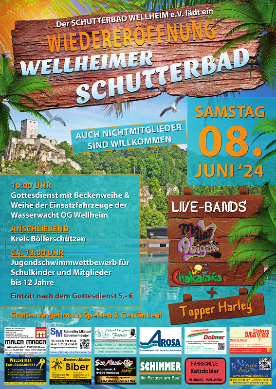 Gebadet werden kann schon seit Anfang Mai im Schutterbad, aber am 8. Juni wird es standesgemäß wieder eröffnet. Der Verein Schutterbad Wellheim hat ein abwechslungsreiches Programm auf die Beine gestellt: Um 10 Uhr findet ein Gottesdienst mit Beckenweihe und Weihe der Einsatzfahrzeuge der Wasserwacht Wellheim statt. Danach kommen die Böllerschützen zu Einsatz. Gegen 13 Uhr beginnt ein Jugendschwimmwettbewerb für Schulkinder. Für beste Sommerstimmung sorgen gleich mehrere Musikacts: Die Bands Mother Abigail und Los Chakalakas werden auftreten und DJ Topper Harley ist ebenfalls am Start. Dazu wird ein großes Angebot an Speisen und Getränken serviert. (ma)