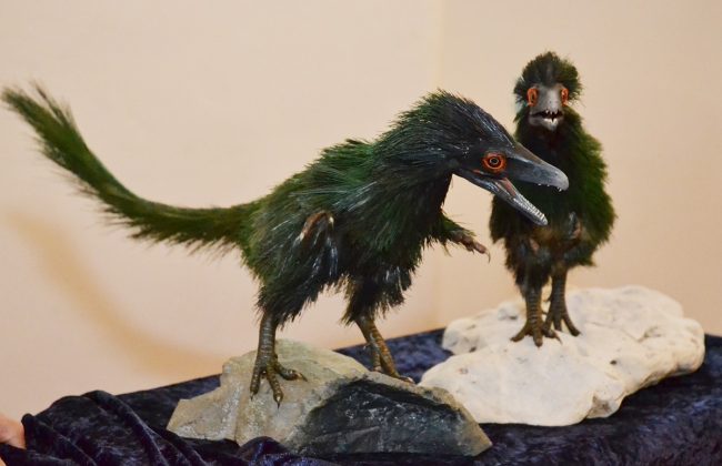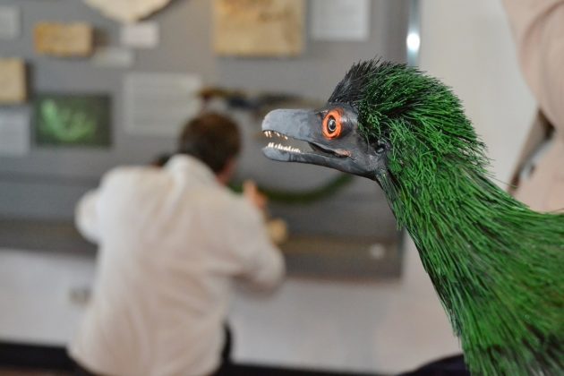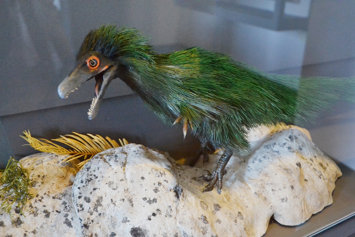 Juravenator bevölkerte vor 152 Millionen Jahren die Inseln im Jurameer. Dabei ist das – bisher einzige Exemplar – im Jura-Museum ein Jungtier, so dass sich seine Größe im ausgewachsenen Stadium nicht festlegen lässt. Dr. Frederik Spindler hat ca. 150 Stunden Arbeit in „Juri“ und „Juvi“ gesteckt, die nun eben auch Jungtiere darstellen. Biologische Materialien wurden dafür übrigens nicht verwendet, so stammen Krallen und Kiefer inkl. Kiefermuskulatur beispielswiese aus dem 3D-Drucker. Der kleine Raubsaurier trägt haarähnliche Urfedern (Nylonborsten), die mit den Haaren der heutigen Säugetiere nicht zu tun haben. Federn waren es aber auch (noch) nicht. Und warum die grüne Farbe? „Dass er grün war ist nicht wahrscheinlich, aber möglich,“ erklärte Spindler.
