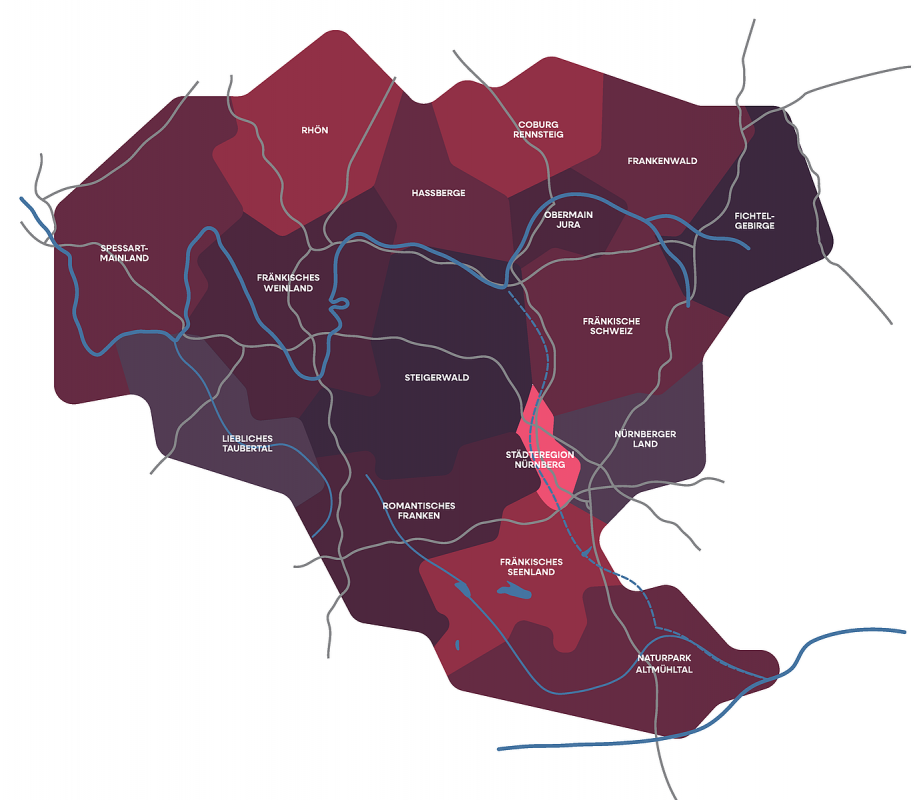 Das Reiseland Franken ist nicht durch politische Grenzen eingeschränkt. Es erstreckt sich über 16 Reiselandschaften, zu denen auch der Naturpark Altmühltal gehört, der sich nicht nur im Regierungsbezirk Mittelfranken, sondern ebenfalls in den Regierungsbezirken Oberbayern und Oberpfalz befindet. Von 1838 bis zur Gebietsreform 1972 zählte Eichstätt zu Mittelfranken, so dass bis heute ein fränkischer Einfluss in den unterschiedlichsten Bereichen – vom Schäuferl bis zur Anhängerschaft des 1. FC Nürnberg – spürbar ist. (ma)