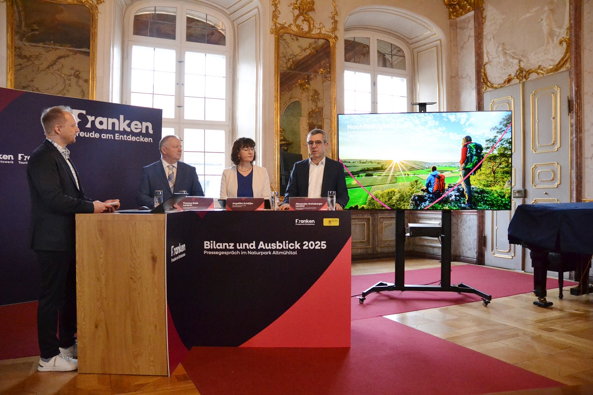 Im südlichsten „Zipfel“ seines Zuständigkeitsgebiets hat der Tourismusverband Franken zum Pressegespräch geladen und so war es der Spiegelsaal in der Eichstätter Residenz, in dem Zahlen und Fakten der zurückliegenden Saison präsentiert und ein Ausblick auf 2025 gegeben wurde. Mit einem Plus von 4 Prozent bei den Gästeankünften und einem Anstieg der Übernachtungen um 2,2 Prozent steht Franken als touristische Destination sehr gut da. Es ist das beste Übernachtungsergebnis in der Geschichte des Tourismusverbands. „Die Reiselust ist ungebrochen,“ erklärte Thomas Bold, Landrat des Landkreises Bad Kissingen und Vorsitzender des Tourismusverbandes Franken. Trotzdem habe man große Herausforderungen wie die schwierige wirtschaftliche Lage und den Fachkräftemangel zu bewältigen. Umso wichtiger sei es, sich auf die Themen Nachhaltigkeit, Regionalität und gute Qualität zu fokussieren.