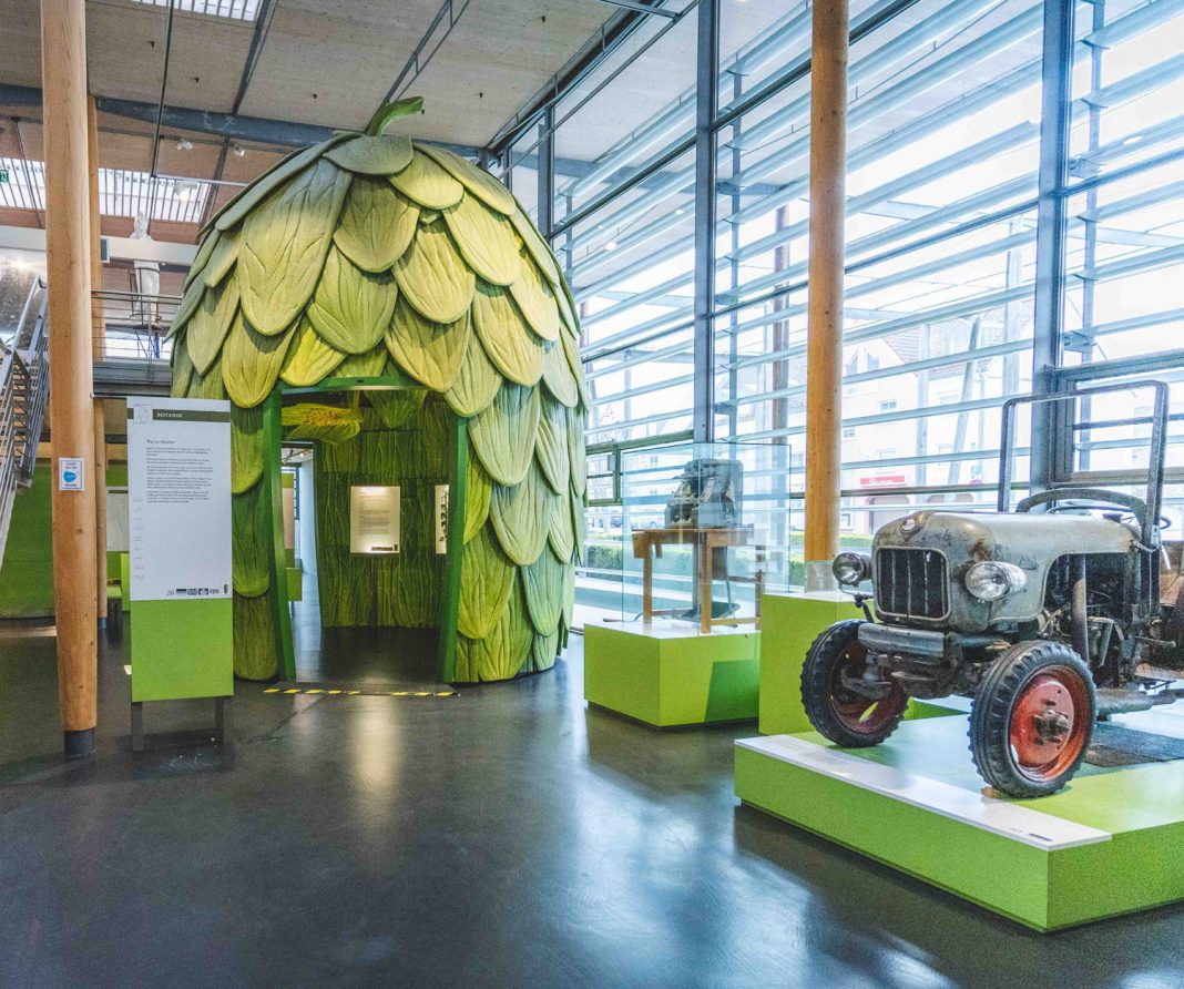 Das auffälligste Objekt im Museum, das einen gleich beim Betreten empfängt, ist die größte Hopfendolde der Welt. Hier kann die Reise in die Geschichte dieser besonderen Pflanze beginnen, die so wichtig für die Hallertau ist. Aber warum ist der Hopfen für das Bier so wichtig? „Er sorgt dafür, dass das Bier stabiler, nicht sauer und besser haltbar wird,“ erklärt Dr. Christoph Pinzl. Hopfen wirke wie ein Antibiotikum, weshalb früher beispielsweise Tuberkulose mit Hopfen behandelt wurde. Dazu ermöglicht er ein geschmackliches Gegensteuern: „Ohne Hopfen wäre das Bier eine süße Angelegenheit.“ Im Museum erfährt man dazu alles über Anbau („es braucht eine bestimmte Lichtdauer“), Wirkung, Inhaltsstoffe, Verwendung und Vertrieb der Pflanze, die schon 1860 etwa von Bayern nach Brasilien exportiert wurde. Der Hopfenanbau entwickelte sich bereits im 19. Jahrhundert zu einem wichtigen Wirtschaftszweig: „Zehn Prozent des Staatshaushalts wurden um 1900 mit Bier verdient“, so Pinzl. Den Bauern in der Hallertau gelang es dabei, die Qualität ihres Produkts zu halten. Heute kommt ein Drittel des Weltbedarfs aus dieser Kulturlandschaft zwischen München, Ingolstadt, Regensburg und Landshut.