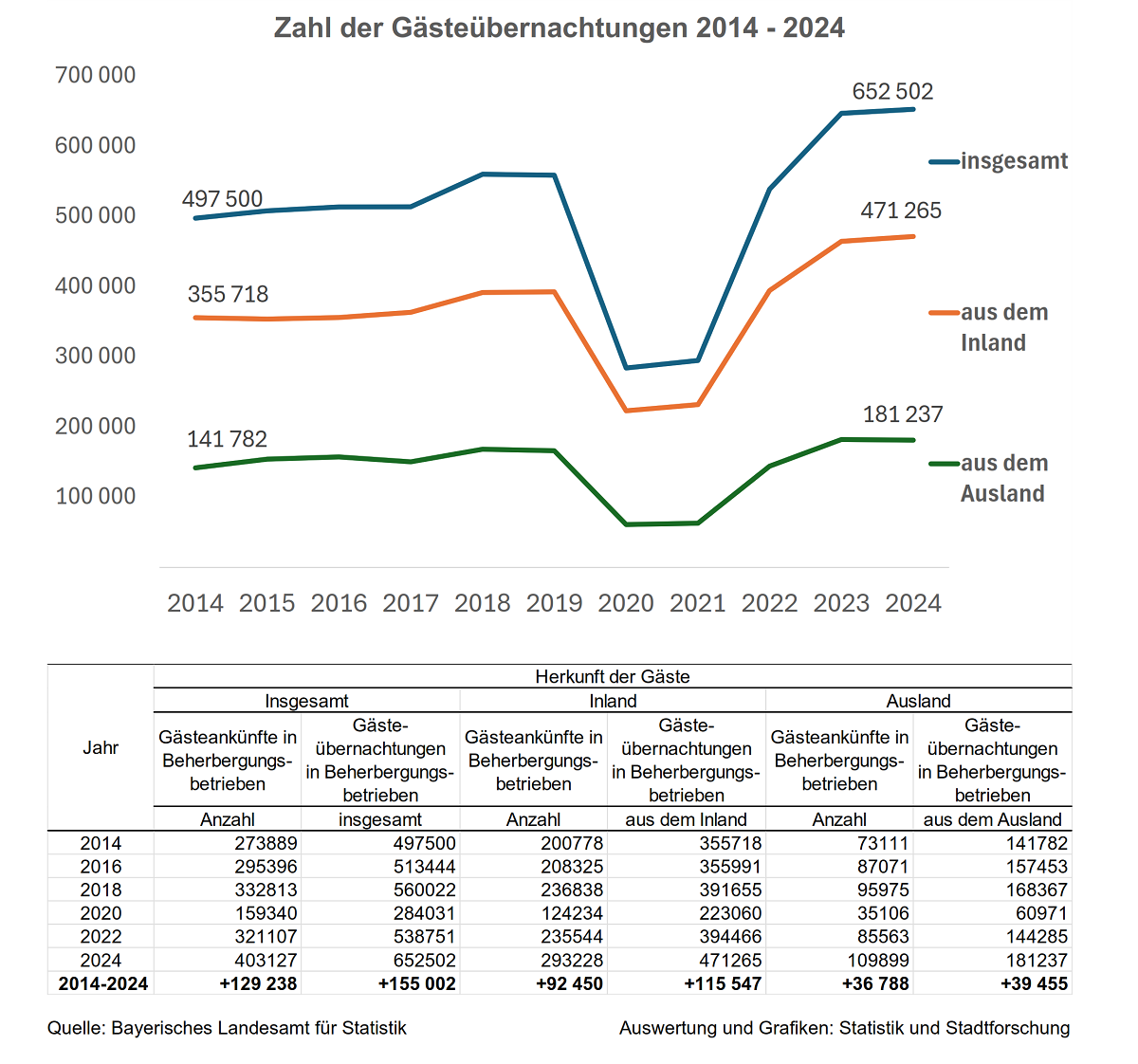 Das Bayerische Landesamt für Statistik veröffentlicht jeden Monat die Zahlen zu den Übernachtungen der Beherbergungsbetriebe. Berücksichtigt werden dabei nur Betriebe mit mindestens zehn Gästebetten. Dazu teilt die Abteilung Statistik und Stadtforschung des Hauptamtes mit: Die Zahl der Übernachtungen nahm in Ingolstadt abgesehen vom Einbruch während der „Corona“-Jahre stetig zu auf zuletzt mehr als 650 000 Übernachtungen im Jahr 2024. Dabei werden auch Übernachtungen auf dem Ingolstädter Campingplatz mitgezählt. Insgesamt gab es mehr als 403 000 Gästeankünfte. Rund 110 000 Gäste kamen aus dem Ausland (+ 36 800 bzw. + 50% gegenüber dem Jahr 2014).