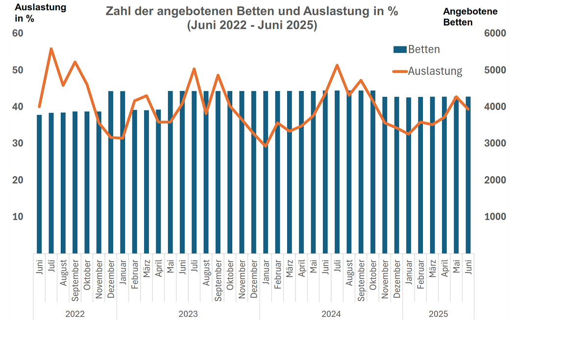 Die Bettenbelegung hatte einen ausgeprägten saisonalen Verlauf mit den Höchstwerten im Juli bei über 50% Auslastung und September (47 %) und dem niedrigsten Wert im Januar mit rund 30 % Bettenauslastung.