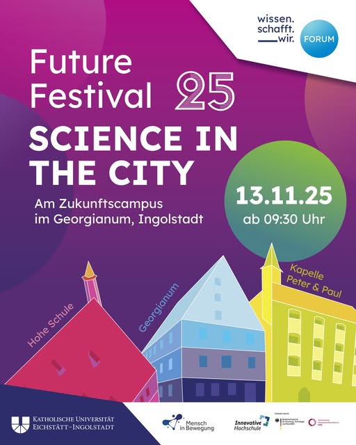 „Mit dem Zukunftscampus möchten wir inmitten der Ingolstädter Altstadt einen neuen, inspirierenden Ort als Impulsgeber für die Entwicklung des Quartiers Hohe Schule, aber auch für die gesamte Stadt schaffen,“ so KU-Präsidentin Prof. Dr. Gabriele Gien. „Natürlich sollen alle Bürgerinnen und Bürger am Aufbau des Campus mitwirken können, denn nur so können die neuen Räume zu einem Ort für alle Menschen werden.“ Schon in der Entwicklungsphase des Zukunftscampus bietet das „Future Festival 25“ seinen Besucherinnen und Besuchern daher die Gelegenheit, sich aktiv an dessen Gestaltung zu beteiligen. Praxisnahe Vorträge zu verschiedenen Themen der Stadtentwicklung wie Nachhaltigkeit, Gesundheit, die Nutzung Künstlicher Intelligenz oder Mobilität in der Stadt bieten zum Festival Anregungen für die weitere Diskussion und Beteiligung.