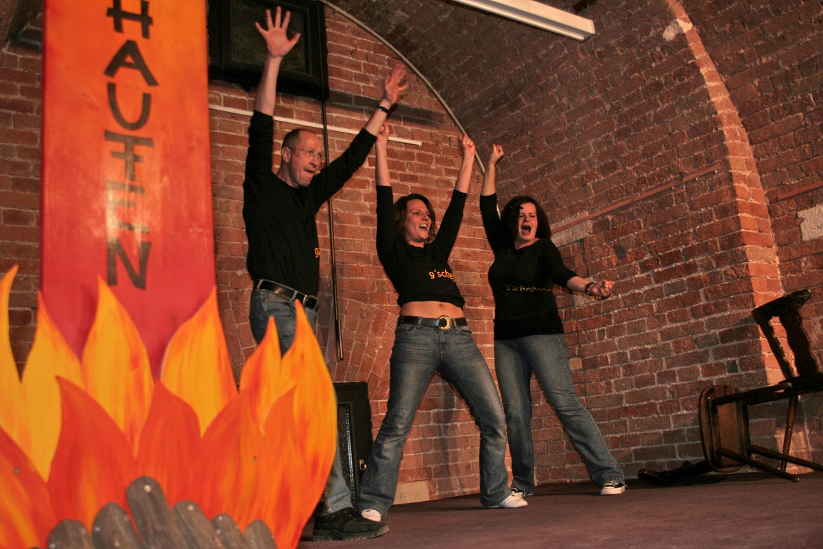Am Anfang war die Landesgartenschau. Also die im Jahr 1992 im Ingolstädter Klenzepark. Dann blühte im Kunst-Werk im Klenzepark die Idee auf, aus Improvisationen Theaterstücke auf die Beine zu stellen. 2002 ist Daniela Richter dort mit eingestiegen und war nicht die einzige, die von den regelmäßigen Gastspielen des Fastfood Improtheaters aus München so begeistert war, dass man das selbst ausprobieren wollte. So entstand eine Ingolstädter Improtheatergruppe, die von Andreas Richter, dem Ehemann von Daniela, geleitet wurde: „Wir haben in der Gruppe trainiert. Das große Thema war dann das Auftreten und hier haben wir die Gruppe ein bisschen hinters Licht geführt,“ erinnert sich Andreas Richter, 1, Vorstand des g’scheiterhaufen. Unter dem Vorwand, dass es sich um Kost-Proben, also öffentliche Proben handeln würde, hat man die Truppe letztendlich im Kunst-Werk öffentlich auftreten lassen – einmal im Monat. Das Ingolstädter Improtheater war geboren. „Bei der ersten Kost-Probe hatten wir zwei Zuschauer, bei der zweiten vier, bei der dritten schon acht. Wir dachten, wenn sich das weiter so entwickelt, wird alles gut“, ergänzt Daniela Richter.