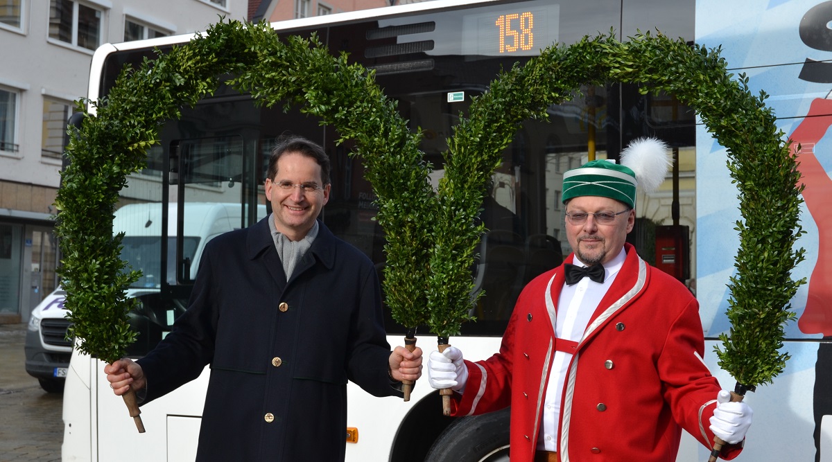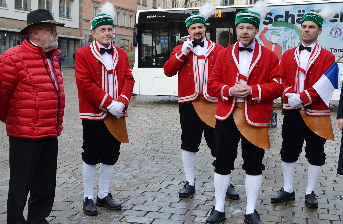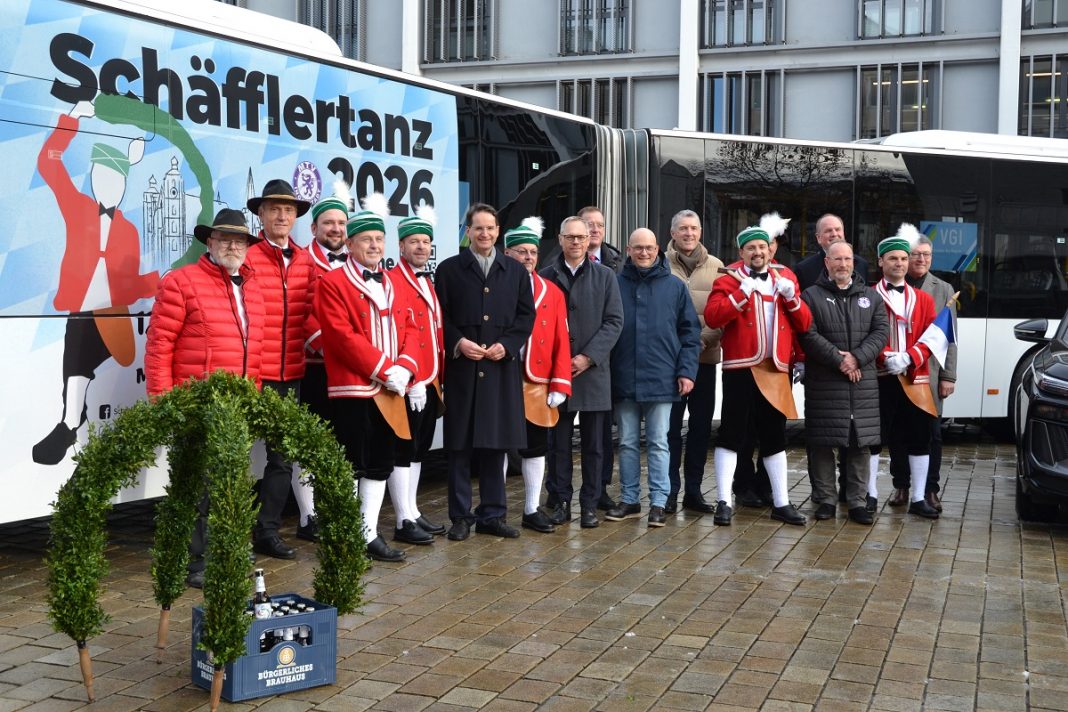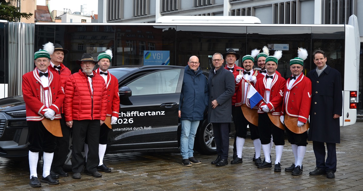 Einen Tag vor dem offiziellen Beginn der Jubiläumstanzsaison 2026 konnten die Mitglieder der Ingolstädter Schäfflergilde die Fortbewegungsmittel in Empfang nehmen, die der ca. 65 starken Gruppe die nötige Mobilität für ihre Auftritte verschafft. Und so fand man sich zum Fototermin mit Gelenkbus, Begleitfahrzeugen, Oberbürgermeister und Hauptsponsoren auf dem Rathausplatz ein.