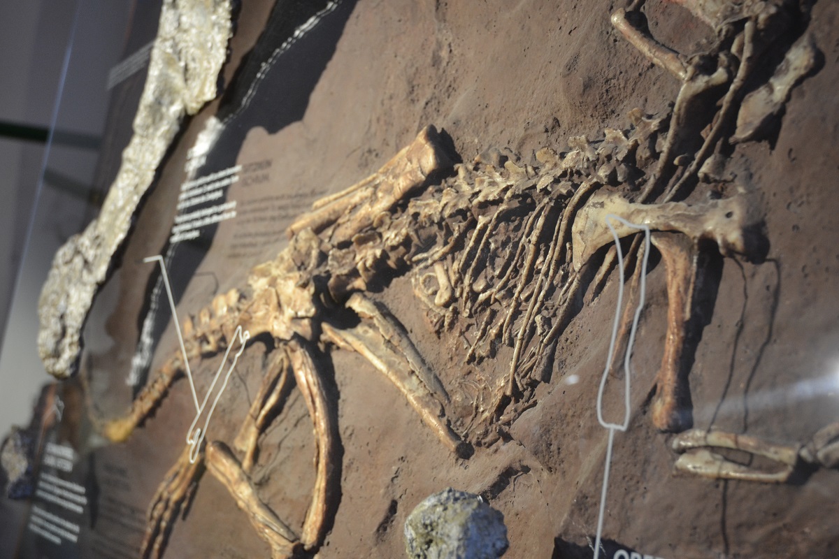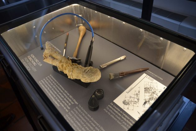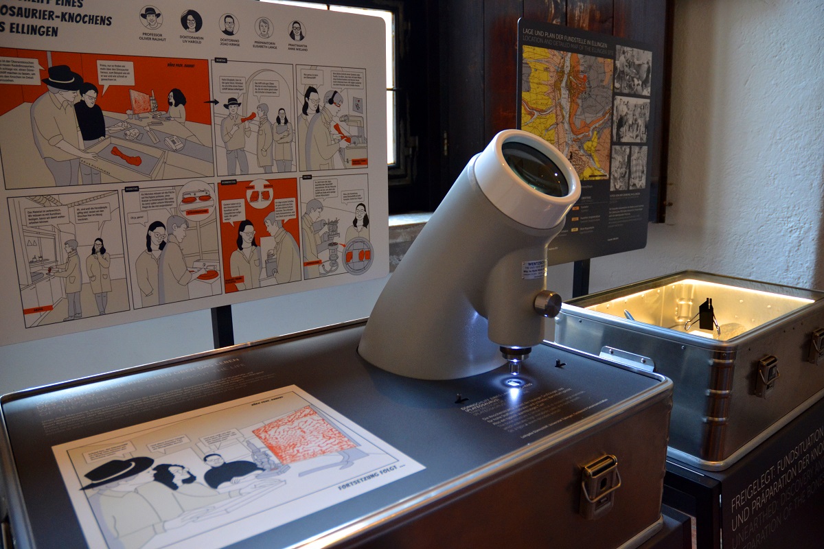 Der Fund kam bereits 1962 bei Kanalarbeiten während eines Hausbaus in Ellingen ans Licht: „Diese Knochen waren nicht die schönsten und eigneten sich nicht direkt für Jurassic Park,“ erklärte die wissenschaftliche Leiterin des Jura-Museums Dr. Christina Ifrim bei der Ausstellungseröffnung. Sie landeten daher im Regal der Bayerischen Staatssammlung für Paläontologie und Geologie. Über 60 Jahre später hat sich der Paläontologe Prof. Dr. Oliver Rauhut der fossilen Überreste angenommen und zusammen mit seiner Doktorandin Alexandra Reutter das „Urvieh“ analysiert – mit überraschendem Ergebnis: Der Raubsaurier aus der Trias (vor ca. 252 bis 201 Millionen Jahren) war ein ziemlicher Brummer! Um das zu verdeutlichen, wird den nachgebildeten Knochenfragmenten (aus dem 3D Drucker) das Gesamtskelett eines typisches Trias-Vertreters gegenüber bzw. darüber gestellt. „Bisher war die Lehrmeinung: In der Trias sind die Dinosaurier entstanden und in der Jurazeit sind sie groß geworden“, so Christina Ifrim. Aber dieses Exemplar – das noch keinen Namen trägt – ist viermal so groß wie der Theropode Coelophysis, der für die Trias typisch ist.