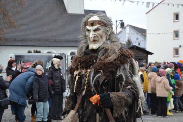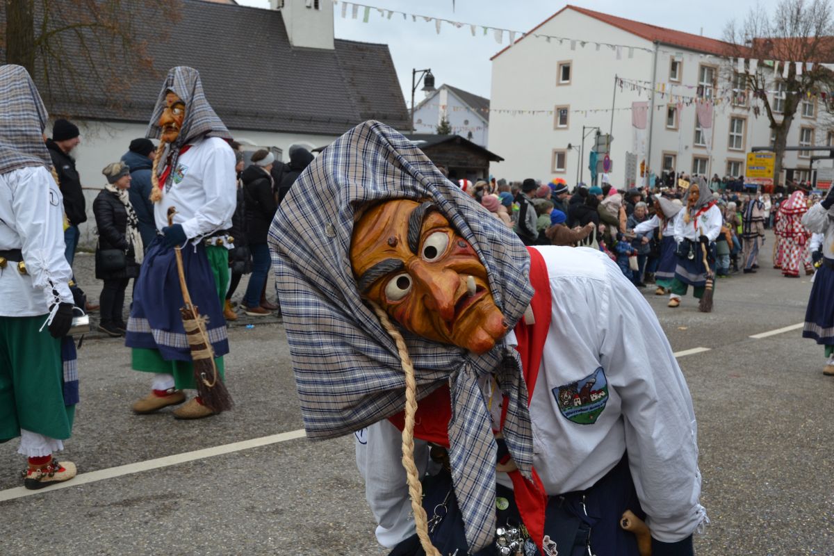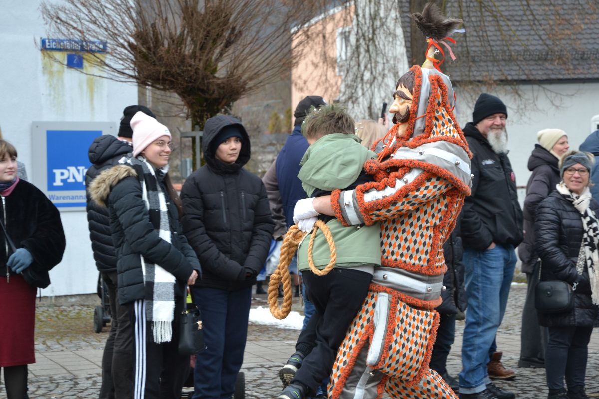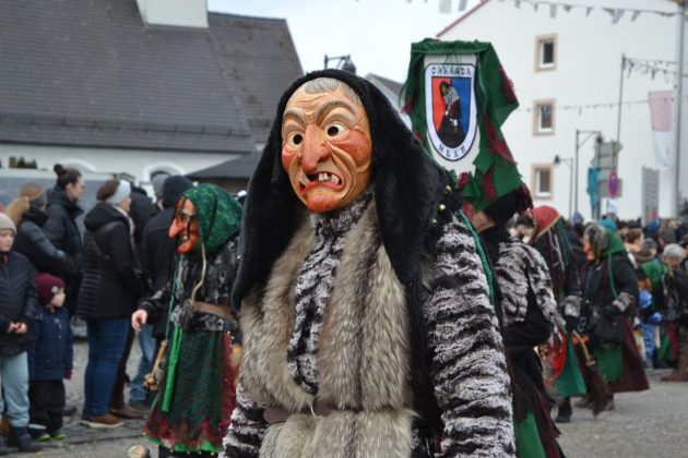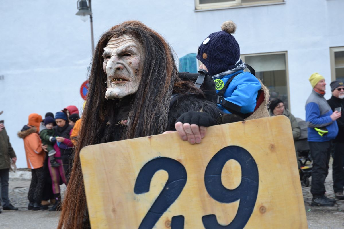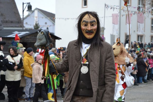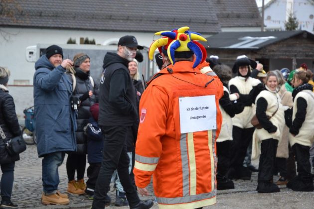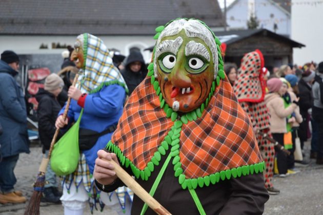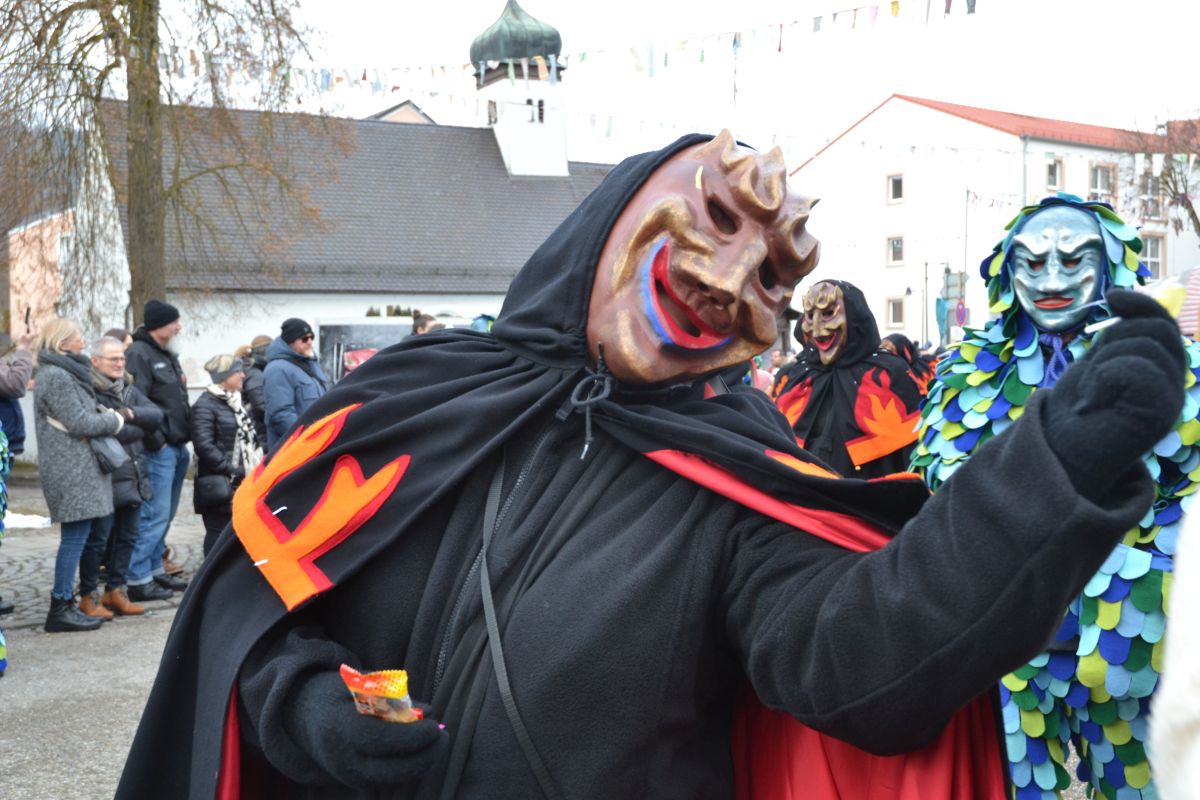Den Besucherinnen und Besuchern wurden Informationen zur Strecke und den beteiligten Gruppen (den jeweiligen Schlachtruf inklusive) an die Hand gegeben – dazu erläuterten Sprecher und Sprecherinnen, wer da gerade unterwegs ist. Den Auftakt bildeten natürlich die eigenen Fasenickl, danach waren Fläggla Bätscher, Narren, Deifel, Bergweible, Hexen, Damische Ritter, Kirchamäus, Flecklasmänner und Butterweible unterwegs – zur großen Freude des Publikums. Am Rand des Umzugs erfuhr der geneigte Betrachter, dass es mit dem Narrentreffen ganz klein los ging und bei der Premiere nach 10 Minuten bereits der erste Pavillon kaputt gegangen war. Zum zweiten Mal vertraute man dieses Jahr daher auf eine eigens aufgebaute Hütte auf dem Marktplatz, die als „Narren-Hauptquartier“ dient und noch den gesamten Fasching stehen bleibt. Im Übrigen hat das Narrentreffen auch schon seine völkerverbindende Wirkung bewiesen: ein Fasenickl aus Kipfenberg hat inzwischen eine Hochburg-Häxe aus Emmendingen geehelicht. (ma)