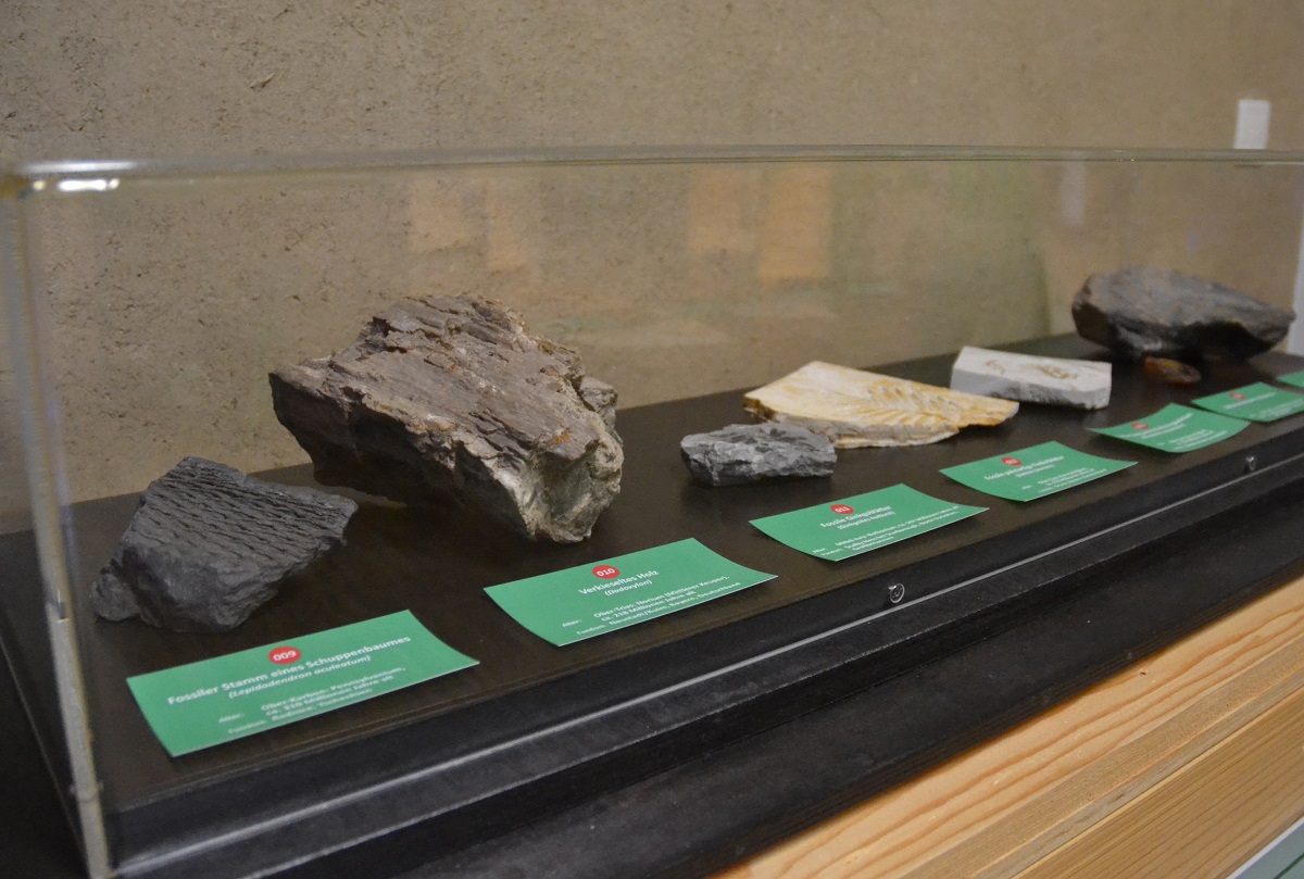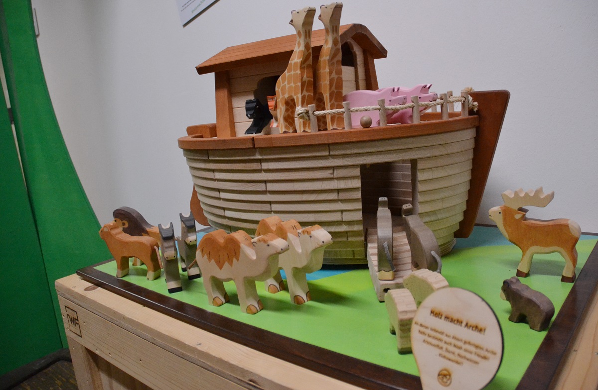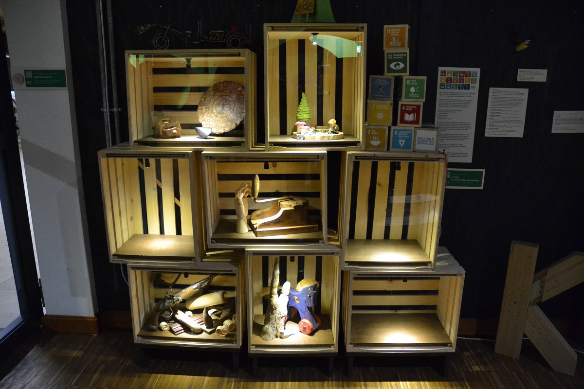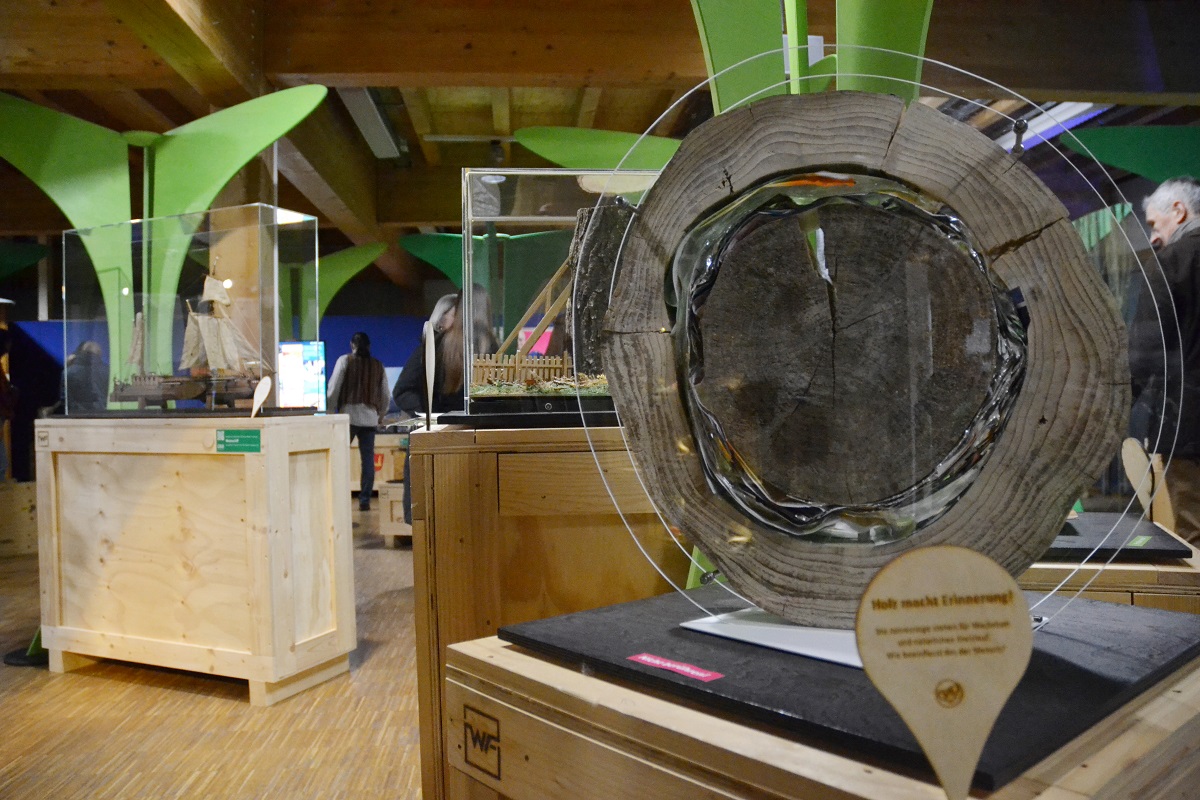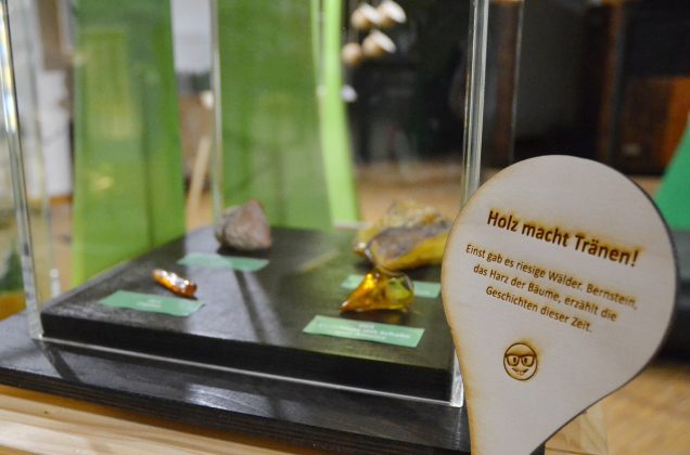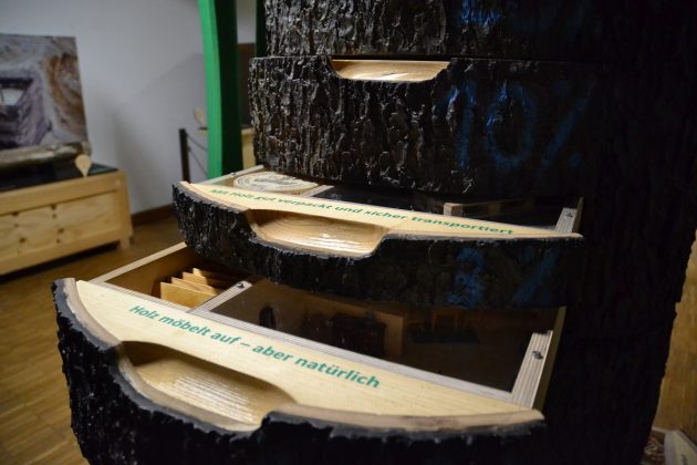 Vom 310 Millionen Jahre alten fossilen Stamm eines Schuppenbaumes bis zum modernen „Klo2Go“ reicht das Spektrum. An einer Jukebox (aus Holz) können Songs mit thematischem Bezug abgespielt werden („Mein Freund der Baum ist tot“), eine Kuckucksmaschine aus Holz macht – na klar – Kukucksgeräusche, ein Holzbuchdeckel aus dem Mittelalter trifft auf Recyclingpapier, in einer Schublade liegt eine Socke aus Holzfaser und sogar ein Hometrainer aus Holz ist mit dabei. Richtig romantisch wird es am Modell der Bräutigamseiche. Hier kann man Herzkarten ausfüllen, die an besagte Eiche in Eutin geschickt wird. Seit 1927 wird das Astloch der Bräutigamseiche offiziell von der Post bedient, seit 1993 hat der Baum seine eigene Postleitzahl. Hier werfen Liebende ihre Partnergesuche hinein: „Sie können hier im Museum jetzt auf Partnersuche gehen!“ erklärte Adrian Siedentopf.