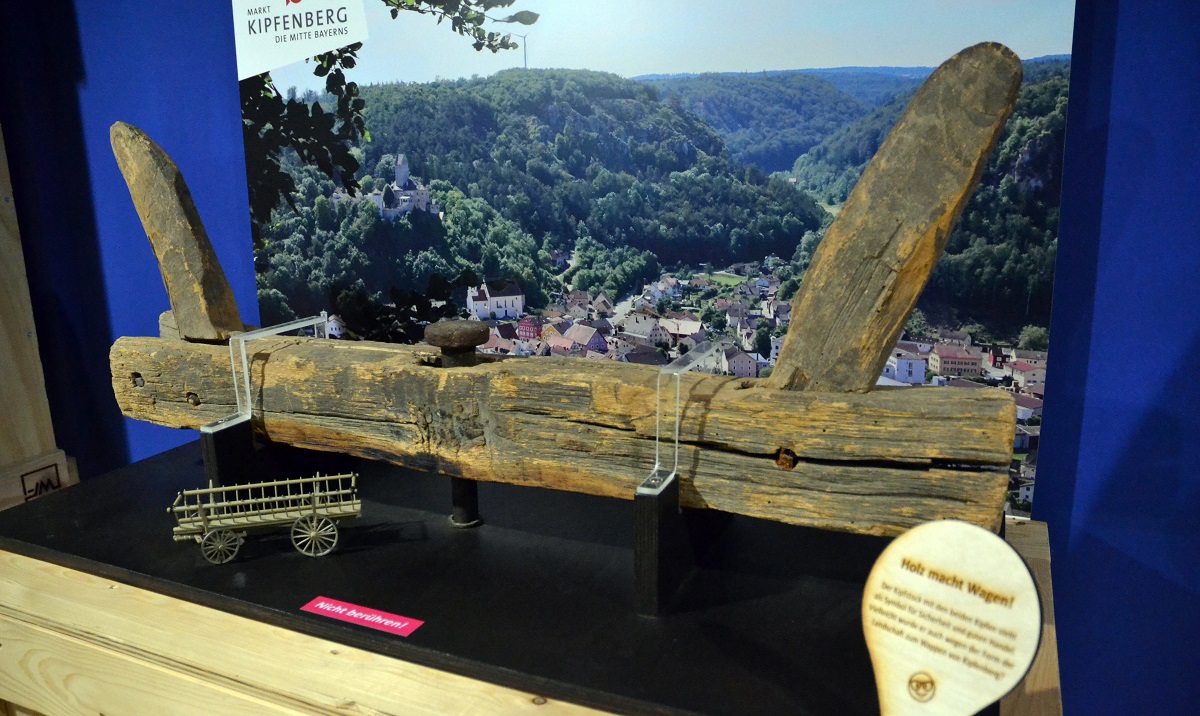 Einen erfolgreichen Anruf hat er offensichtlich im Römer- und Bajuwarenmuseum in Kipfenberg getätigt, denn im Rahmen der Schau ist ein Kipfstock, also ein Teil eines Wagens, aus der Zeit um 1900 zu sehen. So ein Kipf ist übrigens auch im Wappen des Marktes zu sehen.
