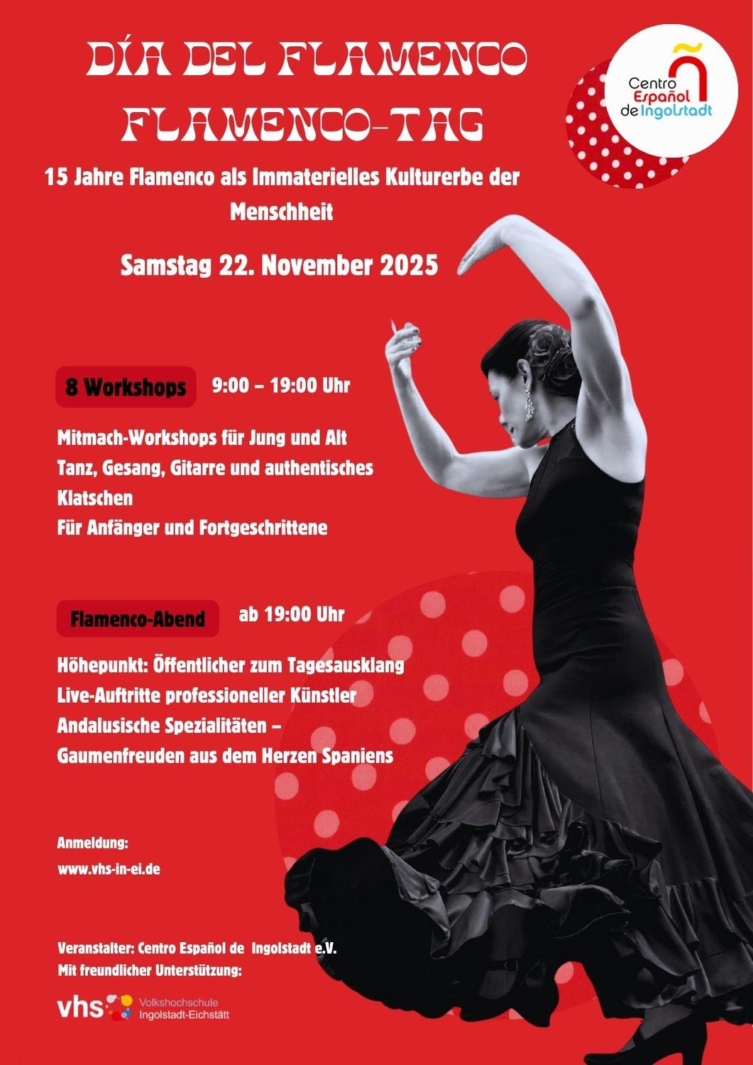 Die Volkshochschule Ingolstadt lädt gemeinsam mit dem Centro Español de Ingolstadt am Samstag, 22. November, zum großen Flamenco-Tag ein. Anlass ist das 15-jährige Jubiläum der Anerkennung des Flamencos als Immaterielles Kulturerbe der Menschheit durch die UNESCO.