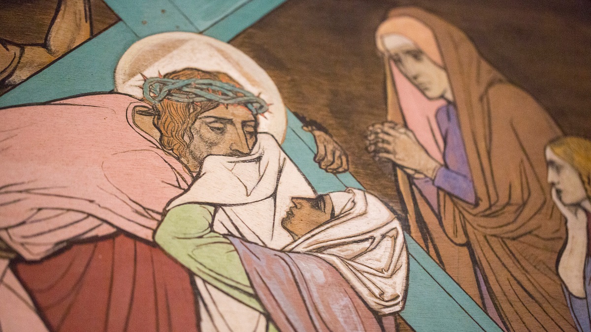 Bild: „Veronika reicht Jesus das Schweißtuch“: Station des Kreuzwegs in der Pfarrkirche St. Johannes der Täufer in Batzhausen. Foto: Anika Taiber-Groh/pde