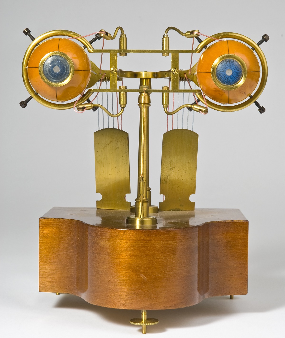 In den 1980er Jahren konnte das Deutsche Medizinhistorische Museum durch Unterstützung des Freistaates Bayern und privater Spender die ophthalmologische Sammlung des Augenarztes Dr. Thilo von Haugwitz erwerben. Die Sammlung beinhaltet über 700 Objekte zur ophthalmologischen Diagnostik und Therapie. Viele davon erschließen sich erst nach längerer Betrachtung und Beschäftigung mit dem Gerät. Nicht so das „Ophthalmotrop“ (wörtlich: Augenwender) nach Christian Georg Ruete (1810-1867) aus dem Jahr 1857. Hier genügt ein Blick, und schon erkennt man, dass hier ein Augenpaar nachgebaut wurde. Aber was hat es mit den merkwürdigen Schnüren auf sich, die an den beiden hölzernen Augäpfeln angebracht sind? Und warum hängen daran kleine Gewichte?