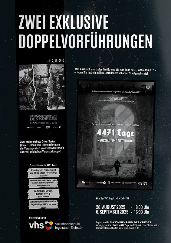Nach einer kurzen Pause folgt die sechsteilige Serie „4471 Tage – Ingolstadt im Dritten Reich“ (140 Min.), ausgezeichnet beim Regionalen Filmabend 2025. Die Serie basiert auf historischen Tonbandaufnahmen von 1989 und wurde durch zahlreiche neue Interviews mit Zeitzeugen und Experten ergänzt. Sie zeichnet die 4471 Tage zwischen der Machtübernahme der Nationalsozialisten 1933 und der Befreiung Ingolstadts 1945 nach – packend, berührend und aufwendig recherchiert.