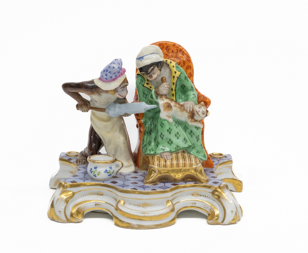 Vorgestellt wird eine fein gearbeitete Porzellanskulptur aus der Zeit um 1860, die das Setzen eines Darmklistiers zum Thema hat – ein in der Medizingeschichte vertrautes Motiv. Das Besondere: Hier sind keine Personen dargestellt. Vielmehr verabreichen zwei Affen in menschlicher Kleidung einem überrascht blickendem Kätzchen gerade einen Einlauf mit einer großen Klistierspritze. Diese Skulptur gehört damit zur sogenannten „Singerie-Kunst“, bei der Affen wie Menschen auftreten, also deren Kleidung tragen und deren Tätigkeiten ausüben. Vor allem im 17. und 18. Jahrhundert nutzten Künstler diese Darstellungsform, um menschliche Schwächen oder Eitelkeiten zu karikieren. Im 19. Jahrhundert erhielt diese Satire durch die Evolutionstheorie von Charles Darwin eine weitere Bedeutungsebene.